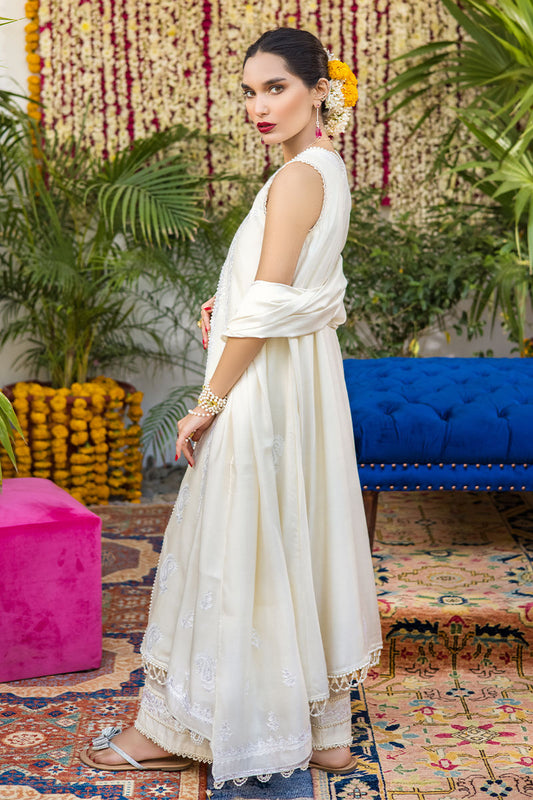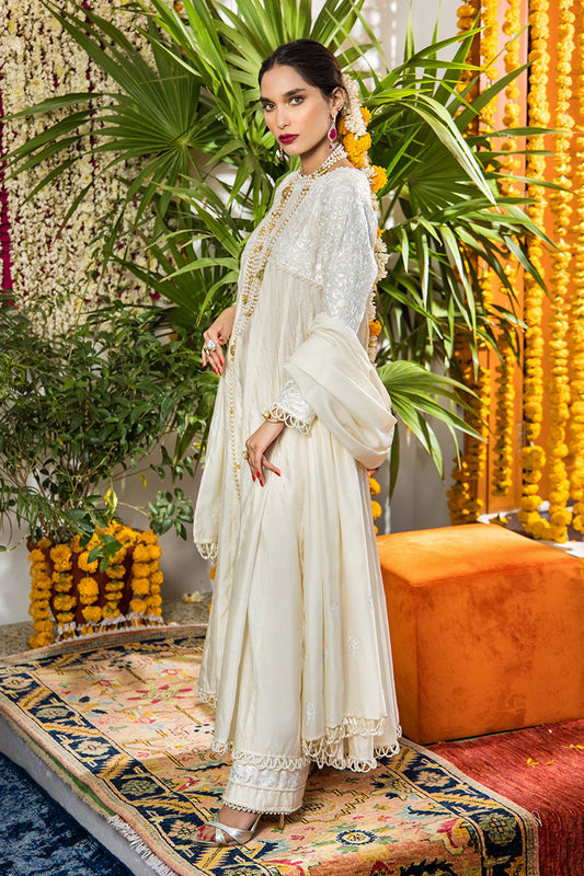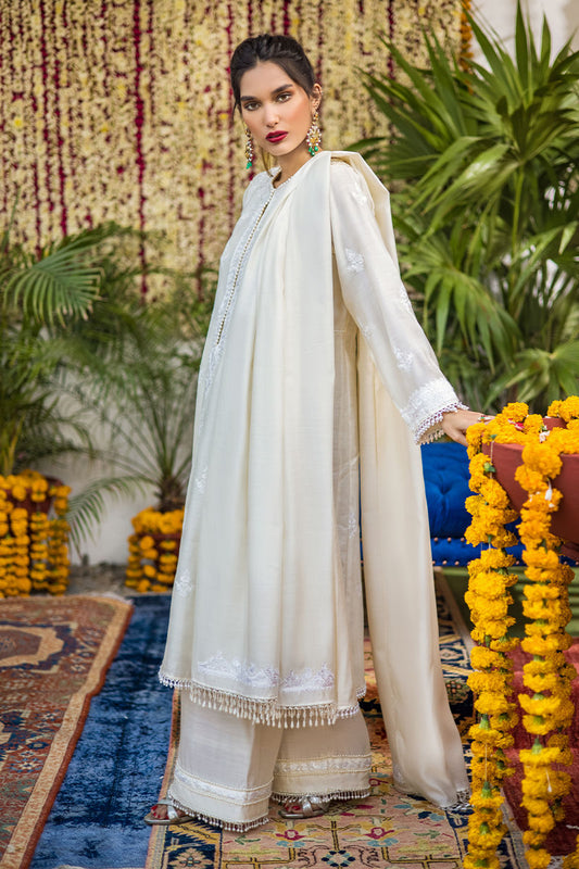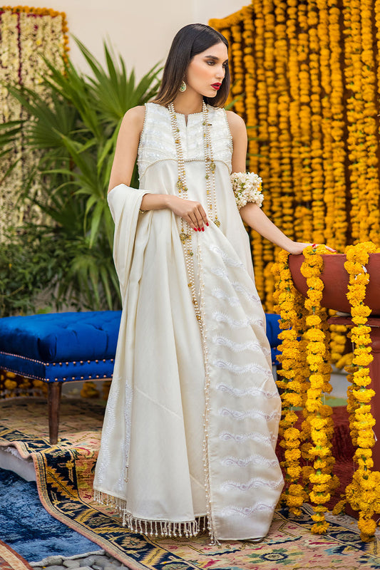Inspired by the snowcapped mountains of the valley, virginal white kataan plays the canvas. The delicately embroidered patterns, adorning different silhouettes, are further enhanced by the understated but elegant glamour of pearls. Sheen Mubarak!