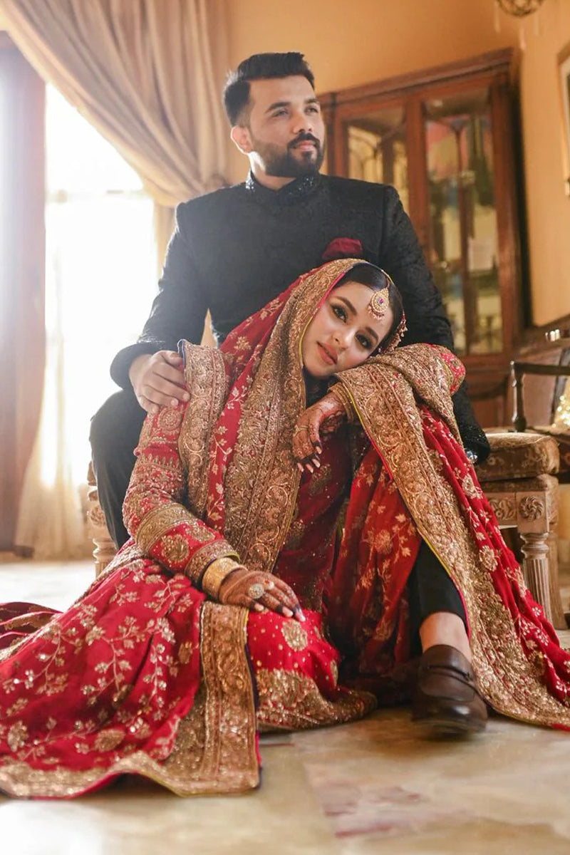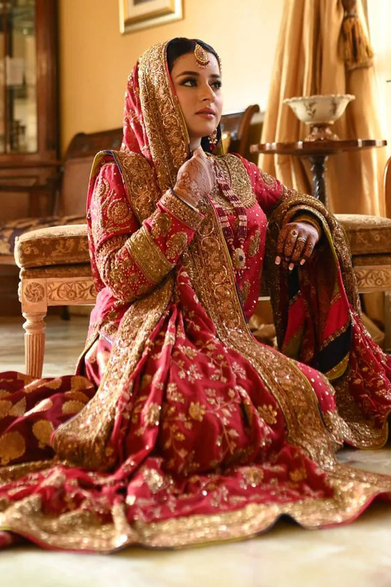 A classic red bridal for Barat, timelessly handcrafted with zardozi, sitara, kamdani, and dabka. The shirt and dupatta are finished with elegant chatapatti, while the dupatta features an all-over handworked jaal and richly embellished borders.
