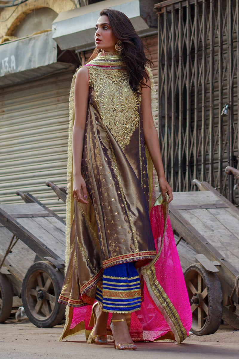 Deep midnight blue/gold pure tissue shirt heavily worked with dabka, naqshi, kamdani, sitara in zardozi work. A flaming hot pink net edged with zardozi and gota border and covered in sparkling sequins work dazzles along side an electric blue silk worked izzar pants.