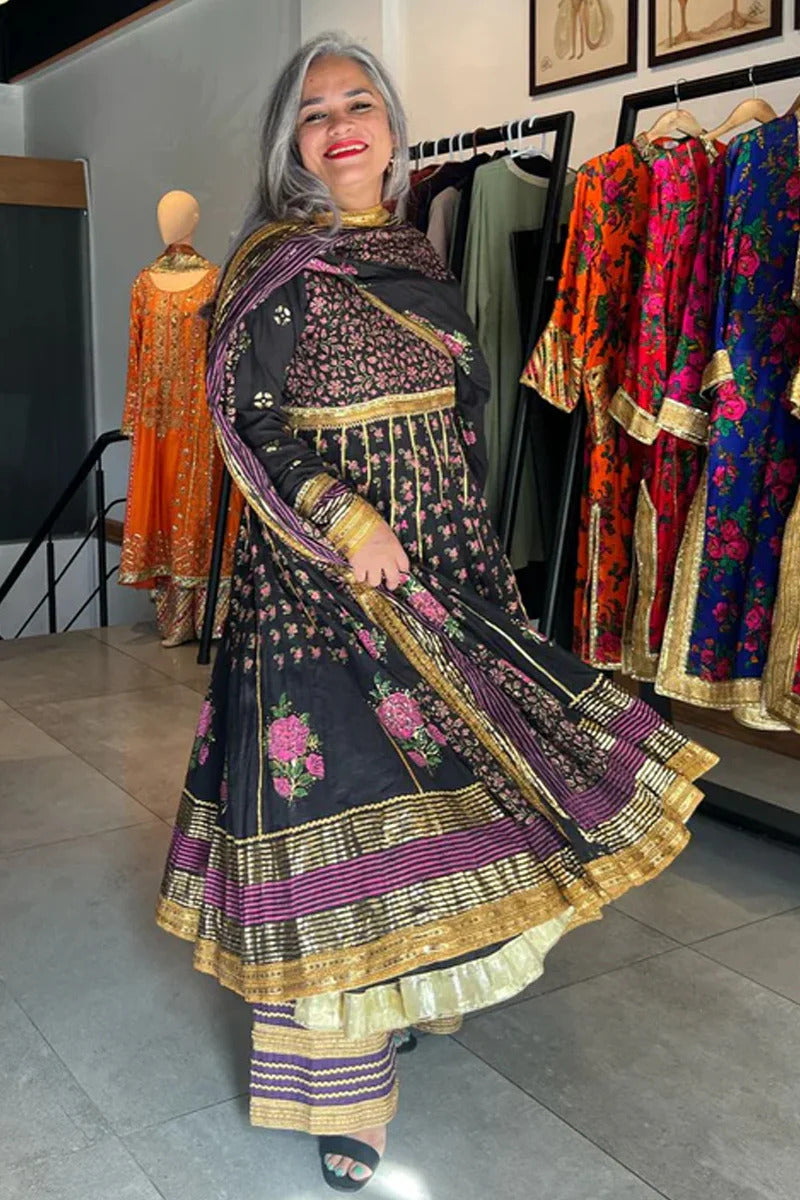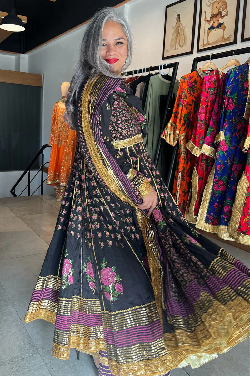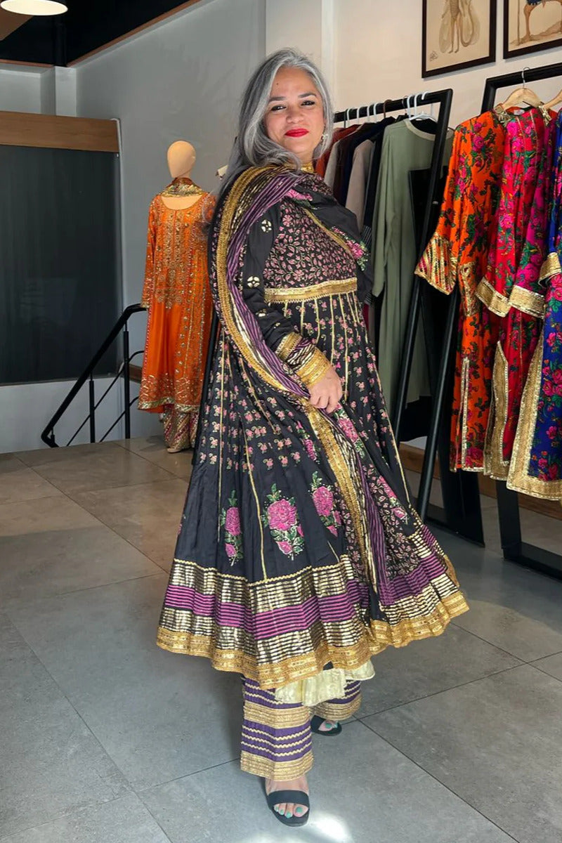 Black malmal Angarkha and dupatta with block and foil print detailing all over with Gota finishing.