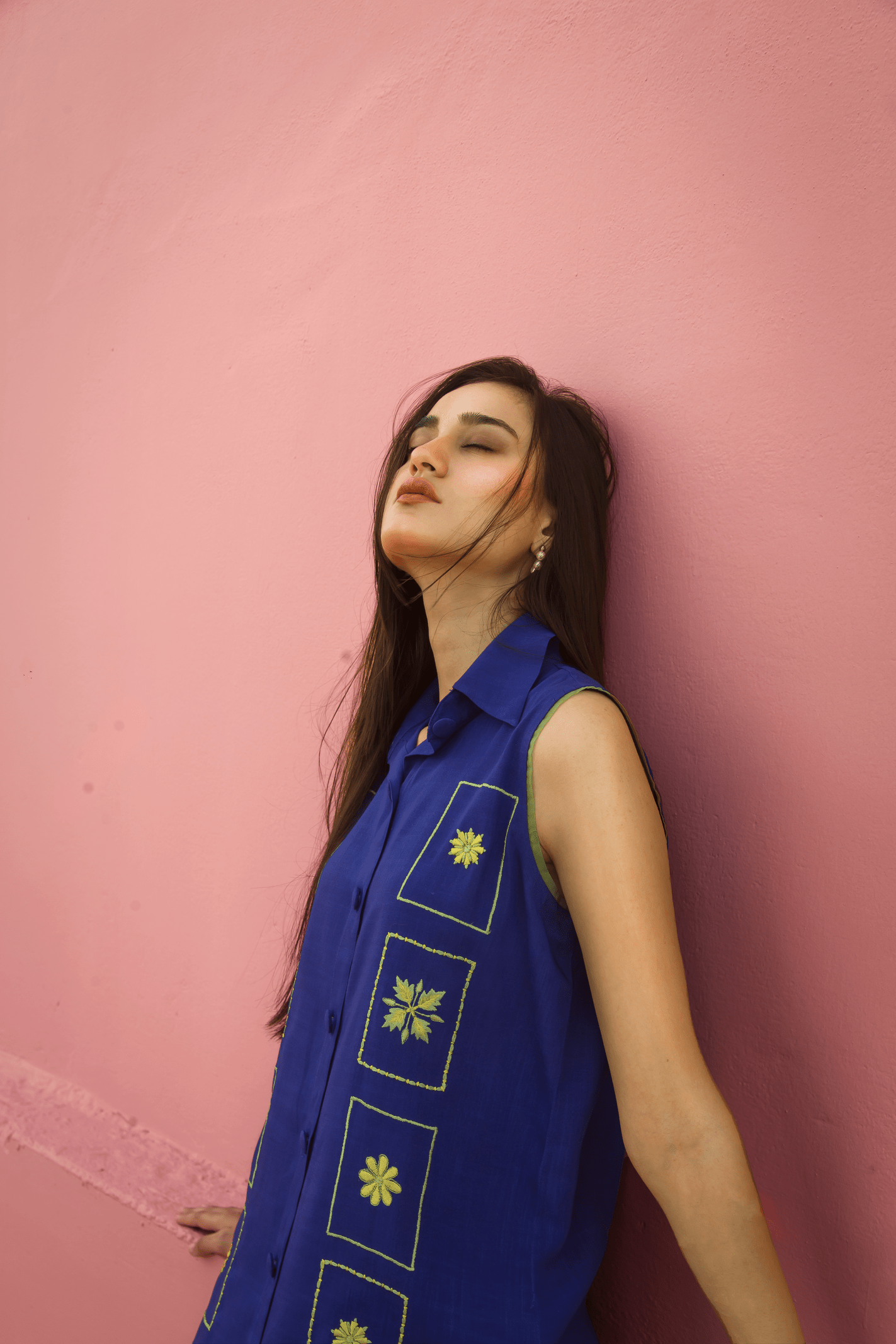 A button-down linen shirt in electric blue with intricate flower motif embroidery, paired with breezy culottes for a fresh and chic look.