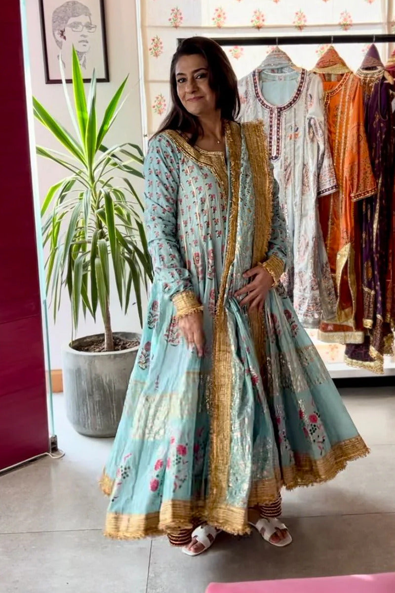 Ice blue 64 kali and dupatta with block and foil print detailing all over with Gota finishing.