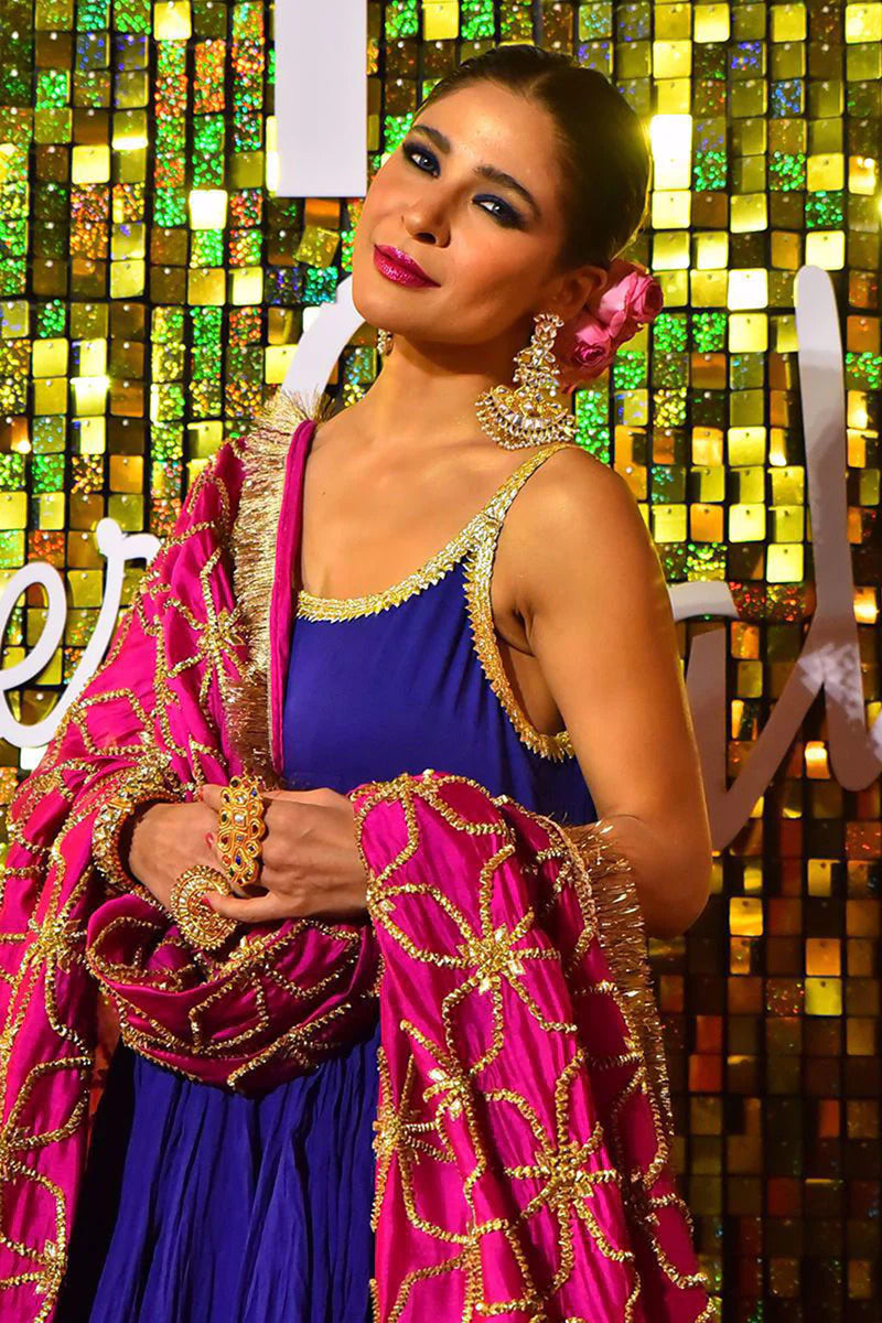 Dressed in an exclusively created design, Ayesha Omar graces the Pink Carpet of Fashion Pakistan Week (FPW.) in Fuscia Pink chiffon dupatta intricately worked with metal based gokhru jaal forming classic mahi pusht (fish scales) pattern, draped over a voluminous deep blue sleeveless, crushed cotton peshwaz and heavily embellished Izzar Pants.
