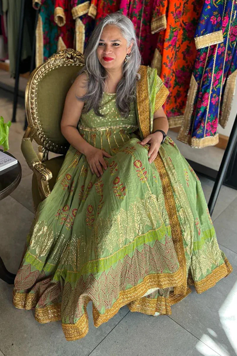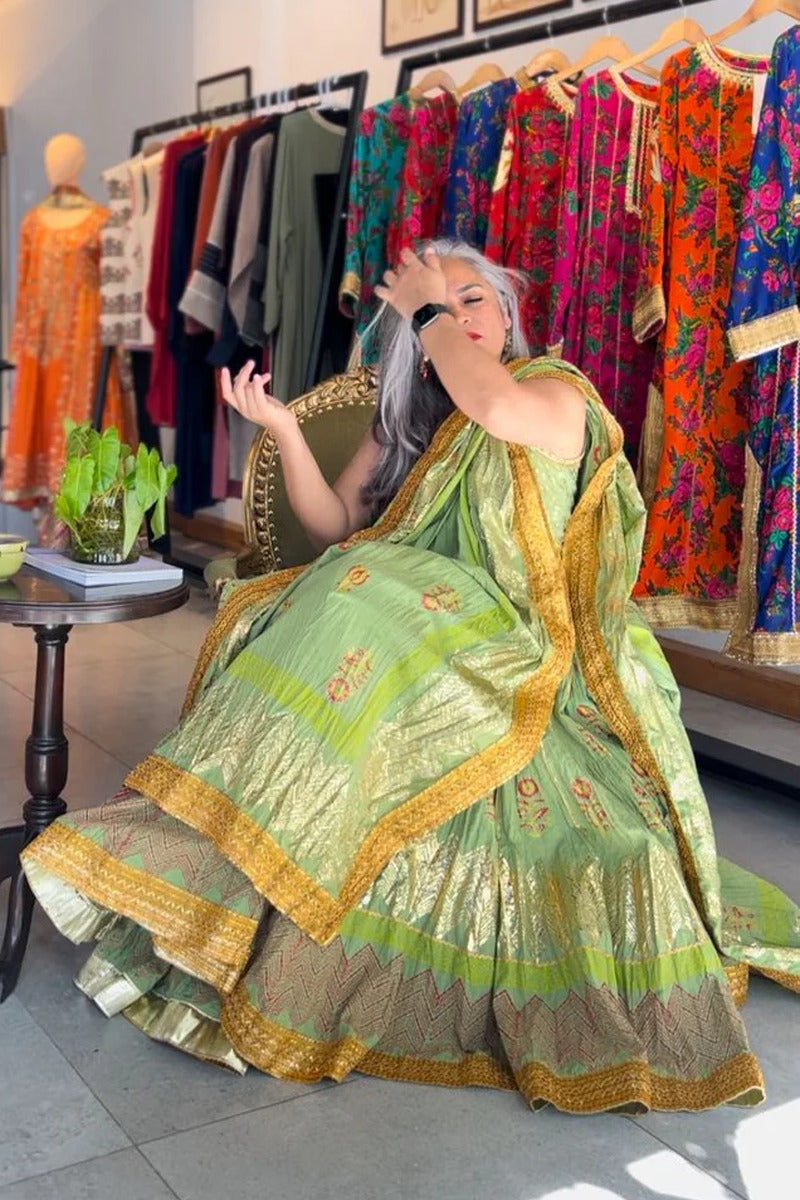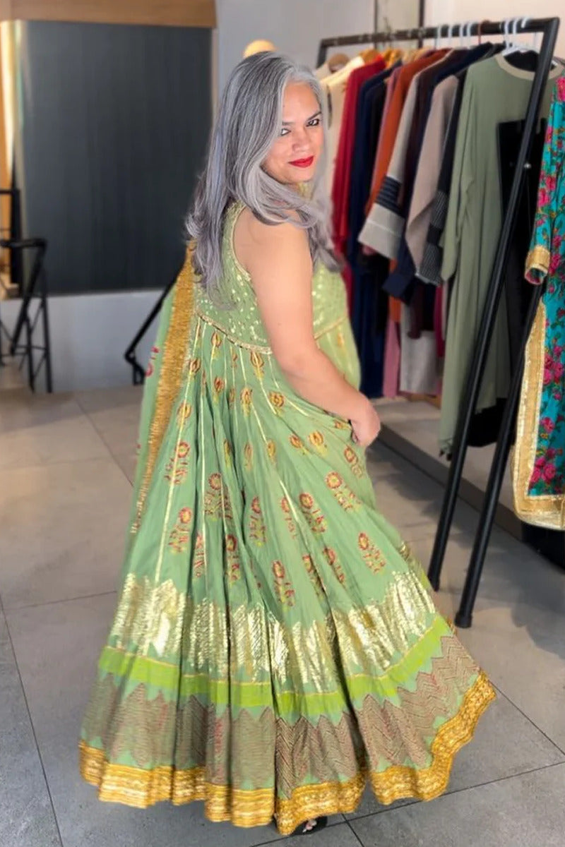 Sage Green malmal strap peshwaz and dupatta with block and foil print detailing all over with Gota finishing.