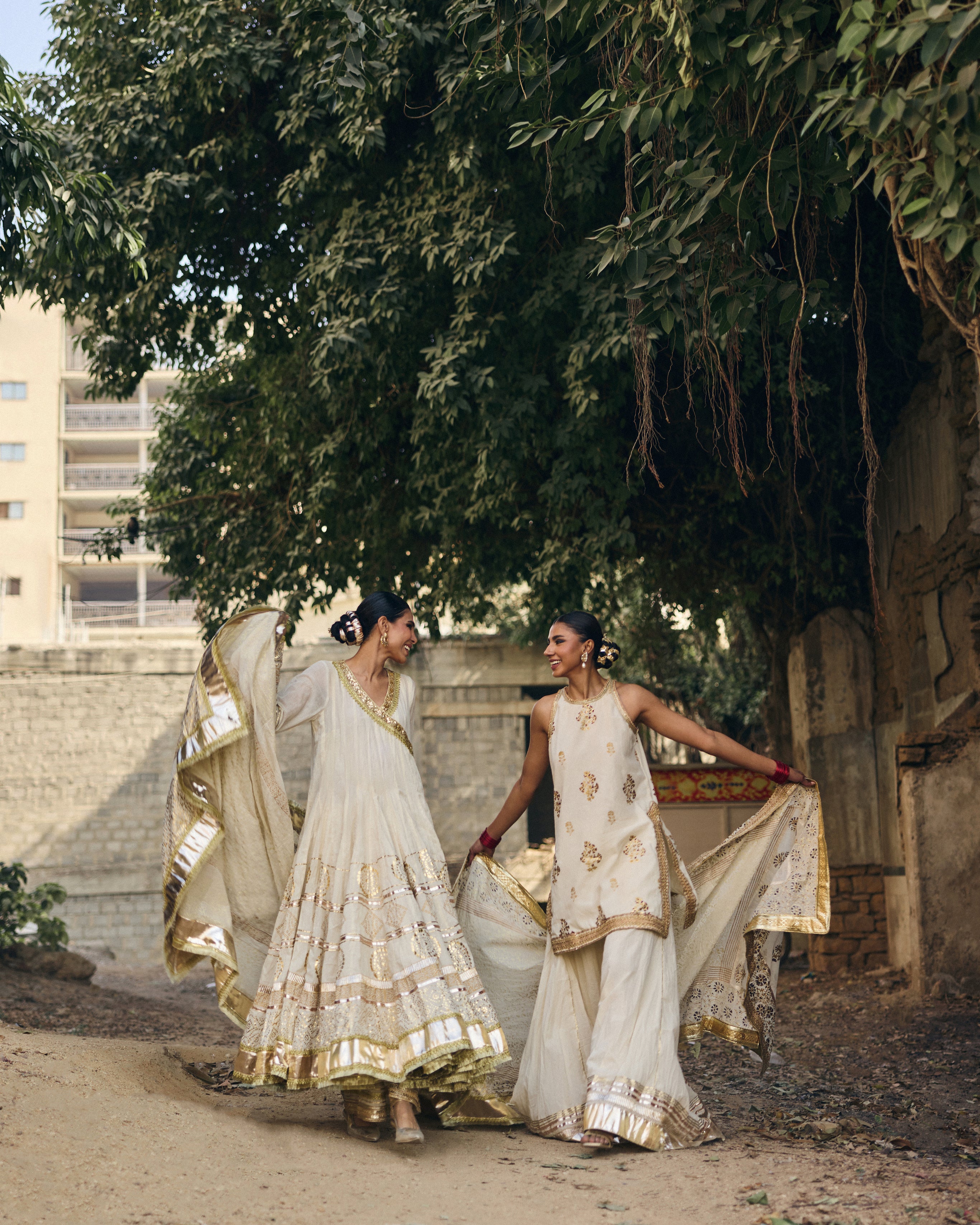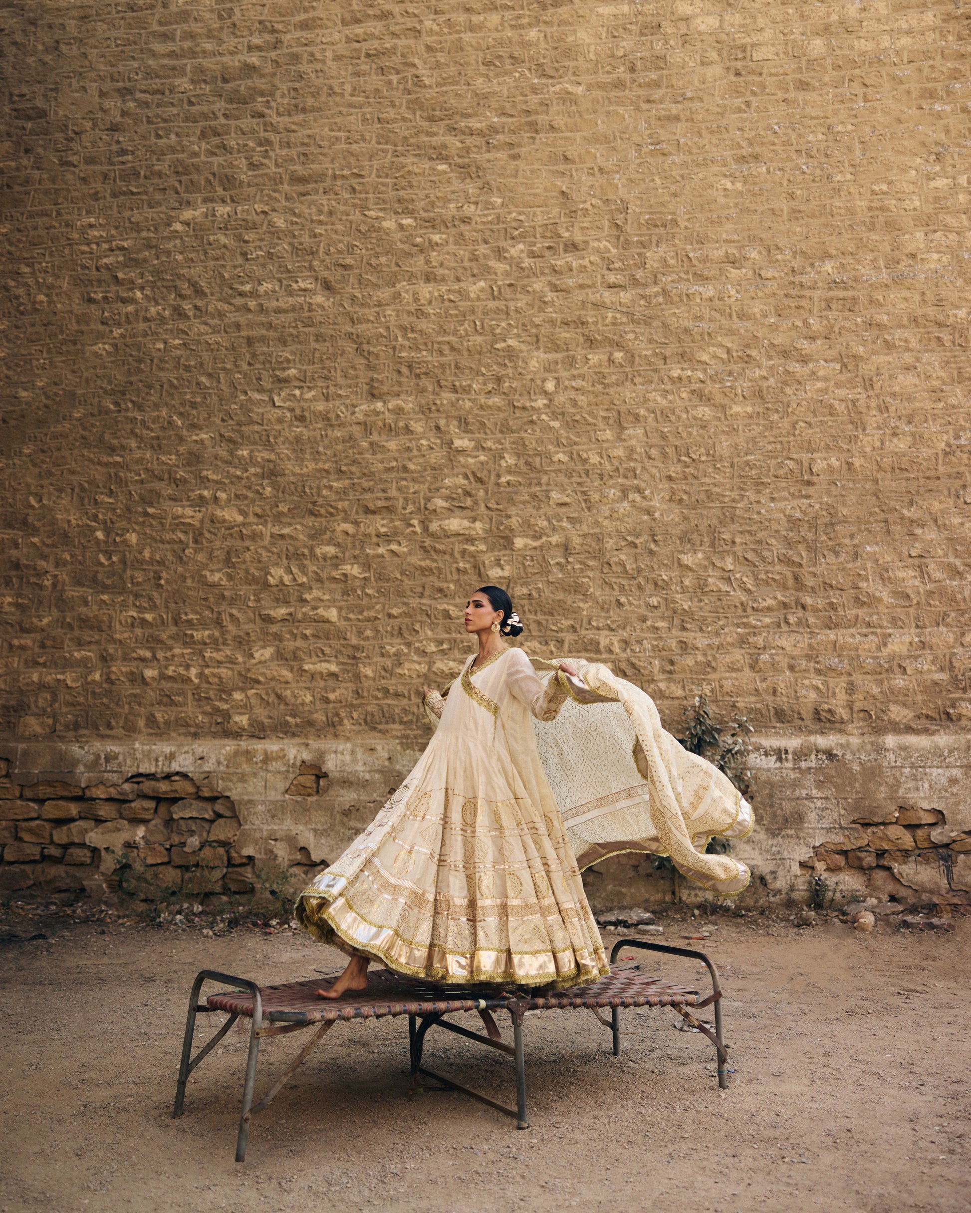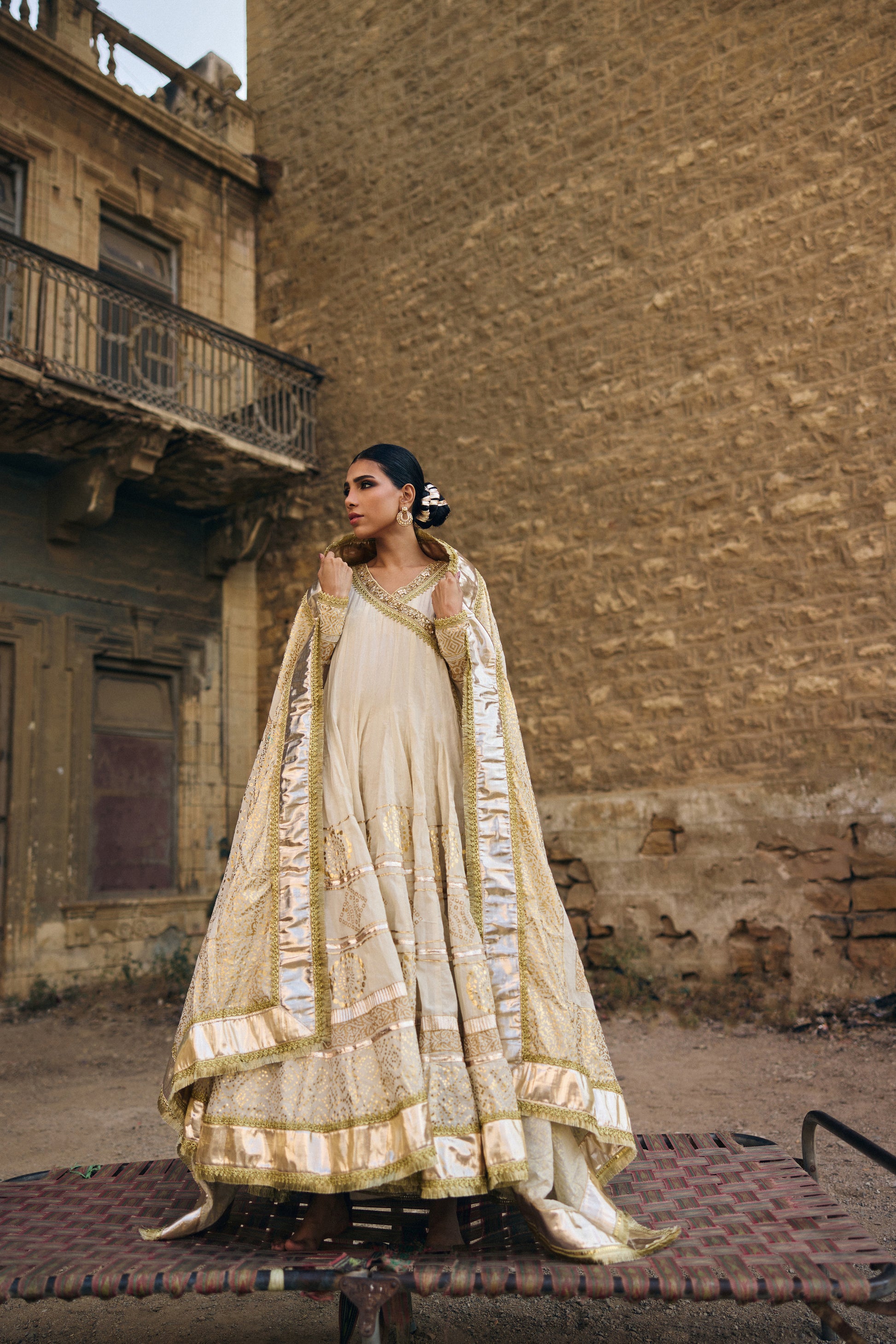 Nath is a striking three-piece Angarkha ensemble crafted from pure hand-woven muslin, designed to offer beautiful volume and a naturally graceful drape. The traditional Angarkha cut gives the outfit a flowing, layered silhouette that moves effortlessly, adding both presence and poise. The ensemble features hand-embellished kota details that bring a soft sparkle and refined texture, enhancing the richness of the overall look. Foil printing and subtle gold accents add depth and elegance, making the outfit glow with a quiet, regal charm. Nath is luxurious yet timeless, perfect for nikah ceremonies, wedding festivities, and any occasion where you want to step into a statement of culture, beauty, and immaculate craftsmanship.