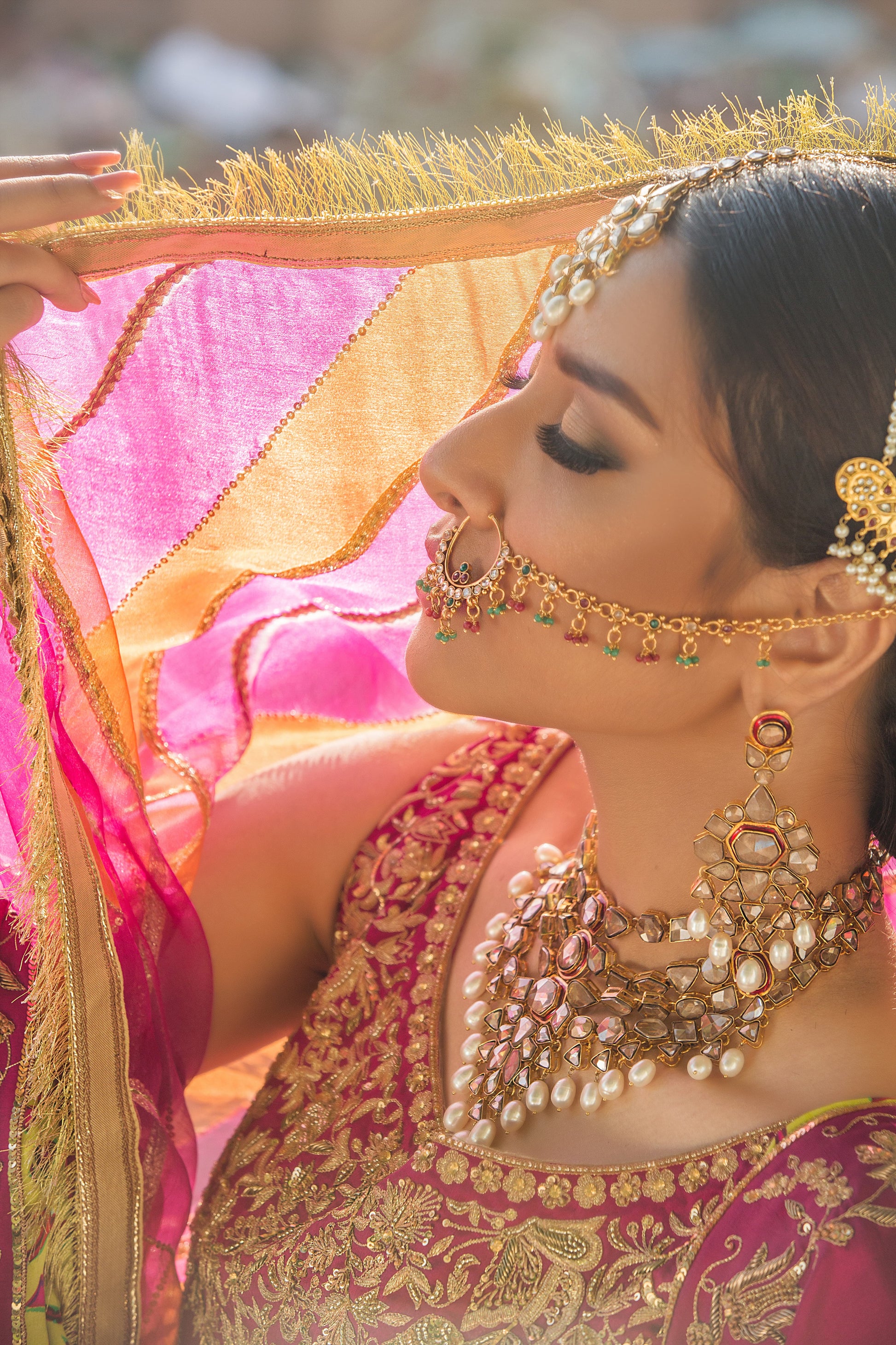 This majestic outfit features a magenta long straight shirt, lavishly hand-embellished with zardozi that shimmers like poetry in motion. Paired with it is a striking lehriya dupatta in hot pink, magenta, and orange, woven with gota in between and finished with gleaming gota borders, radiating festive warmth. Adding depth and richness, a double-sided doshala graces the look — one side in magenta silk embroidered with mahipusht patterns, booti chan, and delicate bails, while the other side reveals citrus green block-printed silk, offering a refreshing contrast of tradition. The ensemble finds its grandeur in a deep red velvet farshi gharara, adorned with exquisite marori work, a timeless ode to royal heritage and bridal opulence.