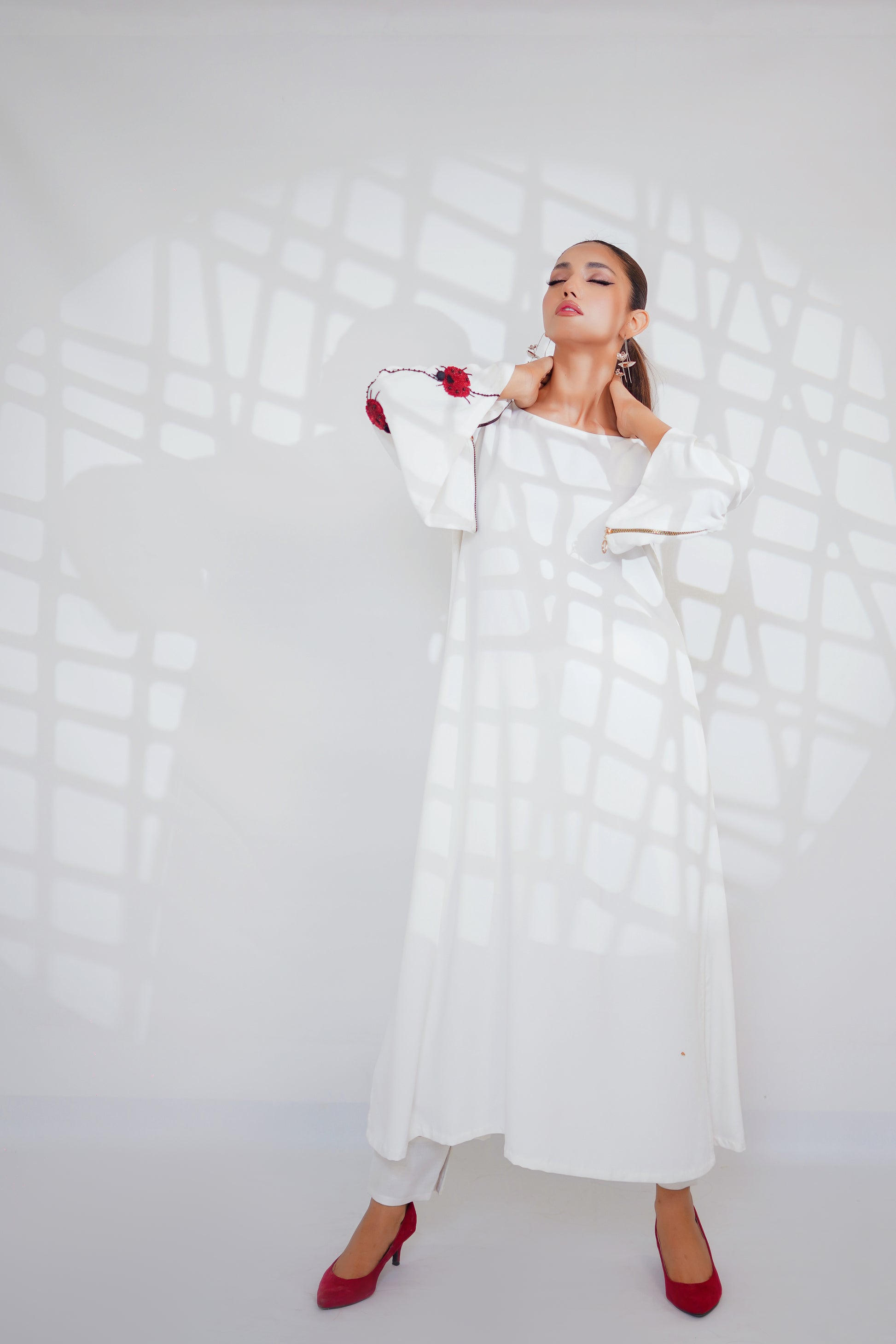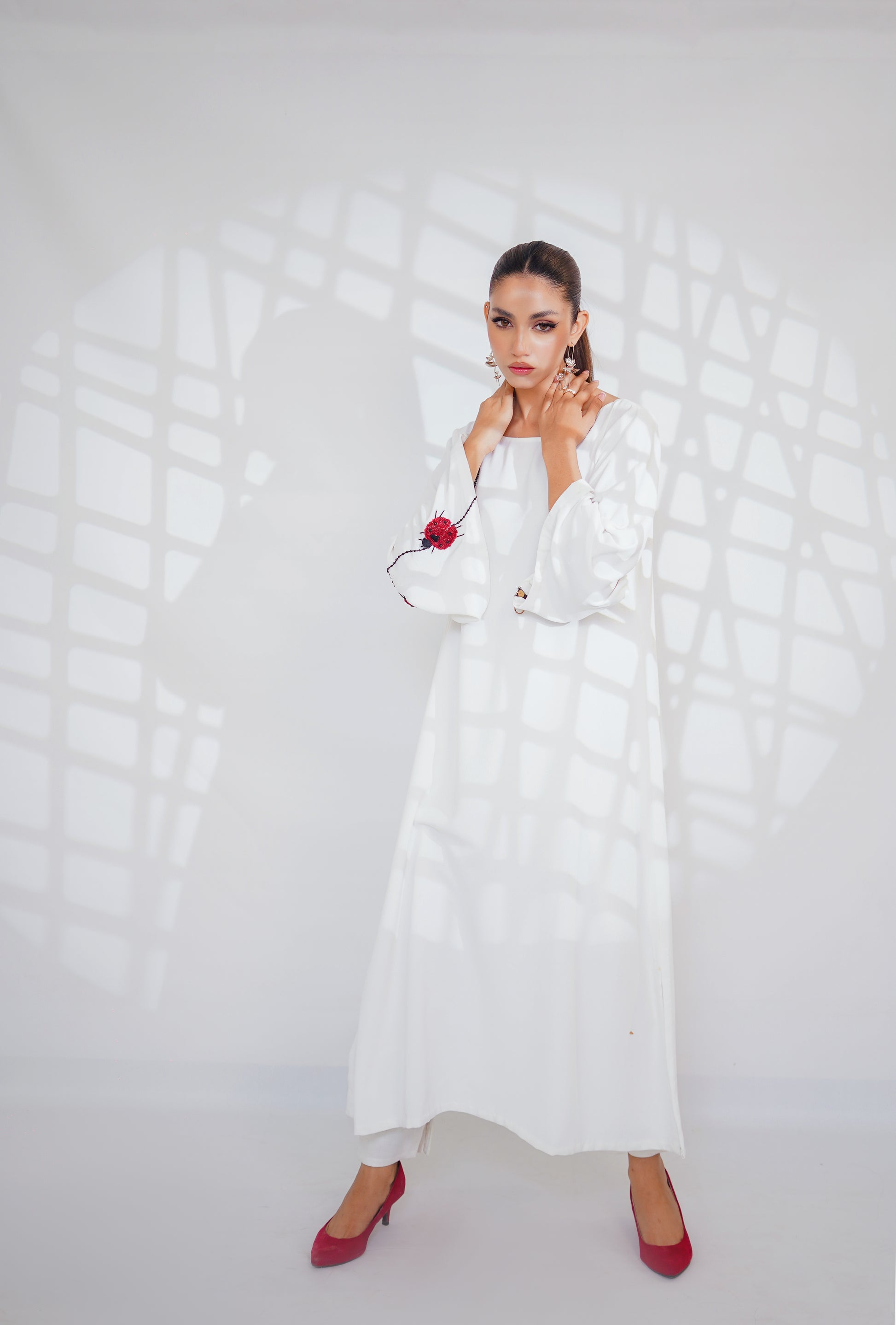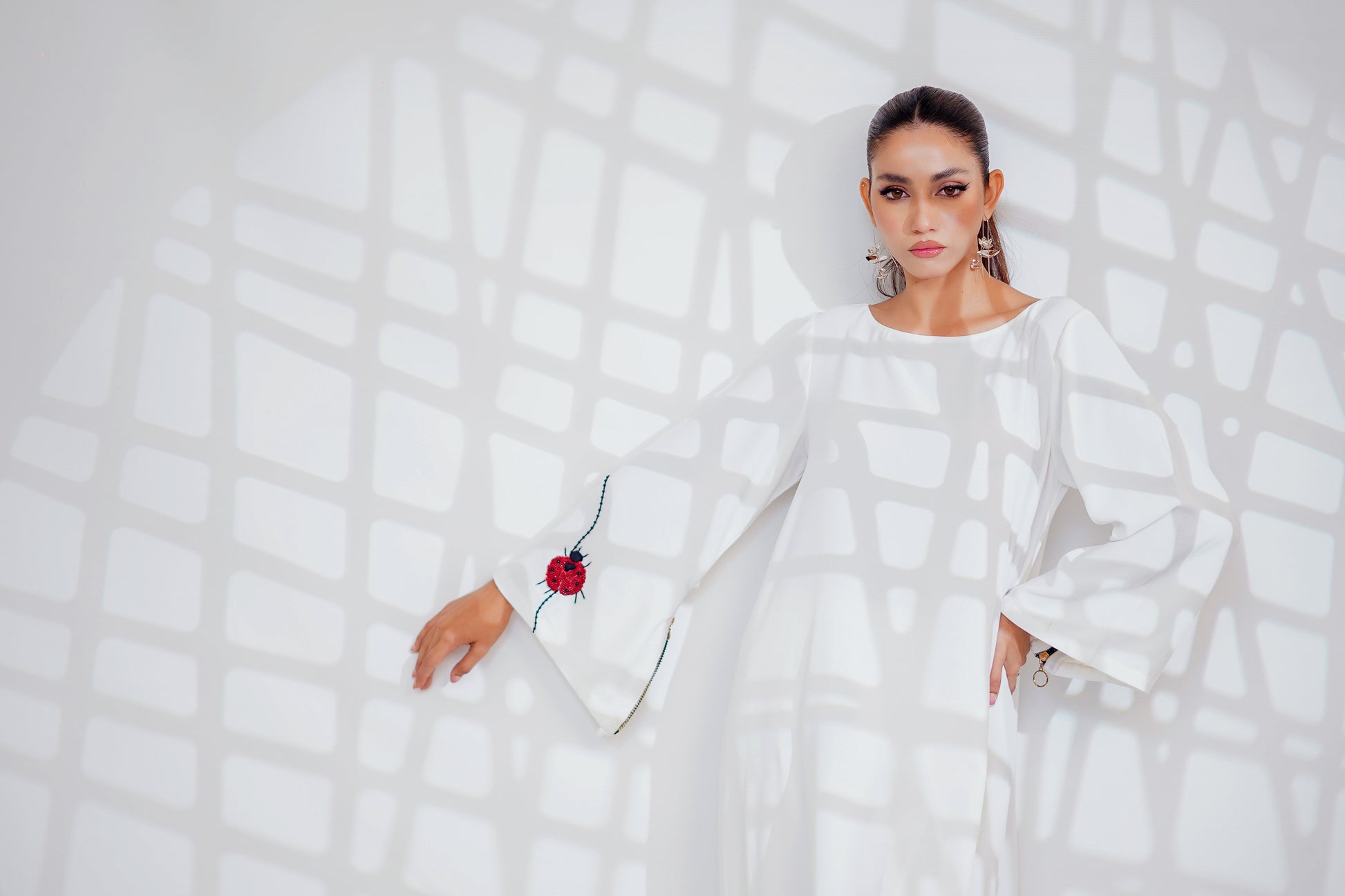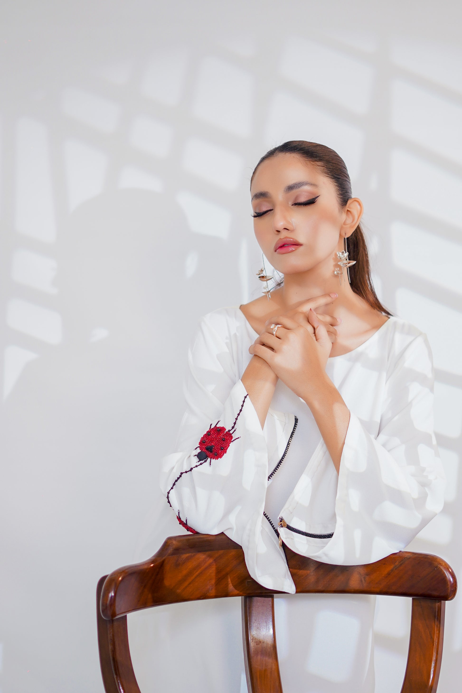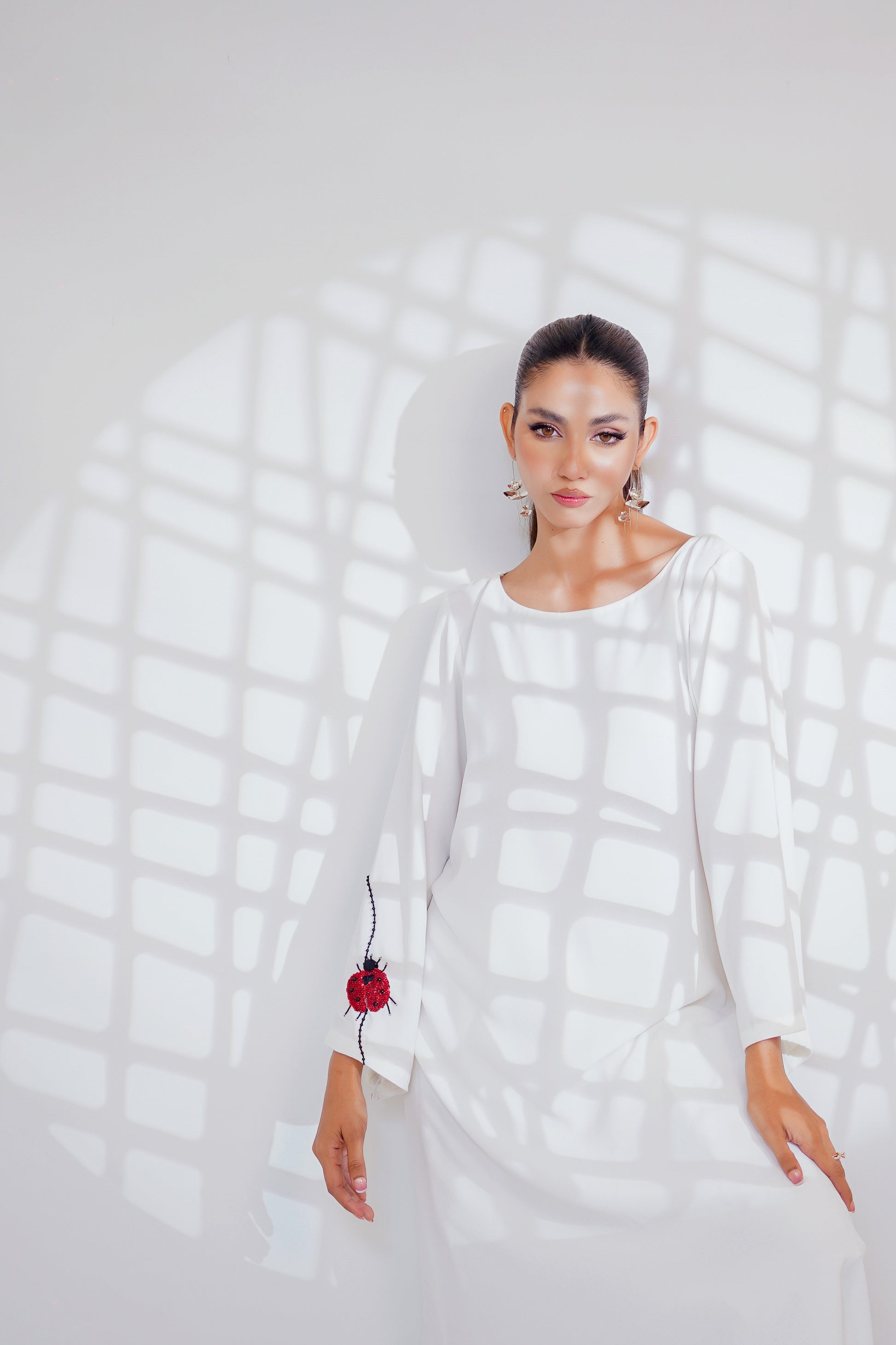 Georgette shirt, featuring a ladybug motif delicately placed on the sleeve. Crafted from lightweight Georgette fabric, this shirt drapes elegantly, offering comfort and style in equal measure.