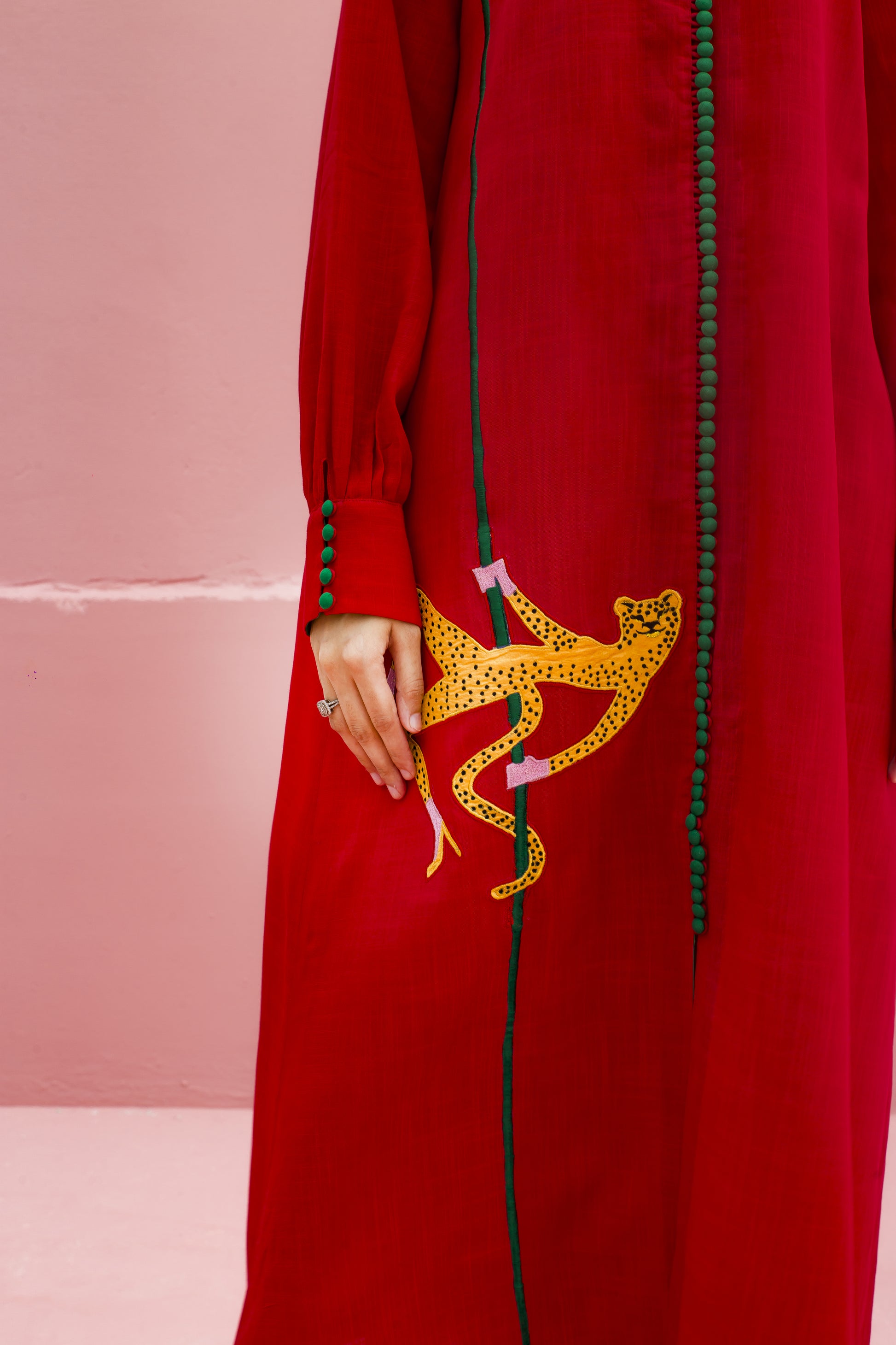 A trendy long shirt in linen with playful cheetah embroidery, paired with relaxed culottes for a bold and casual style.