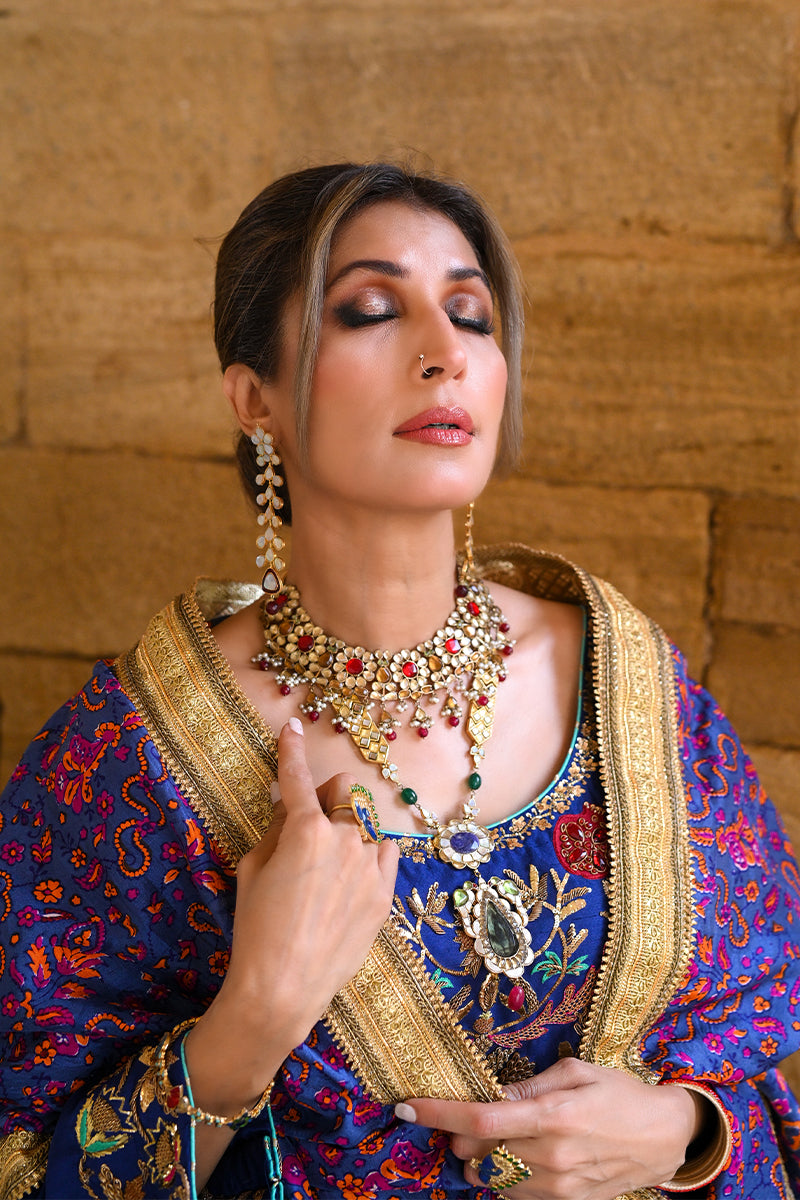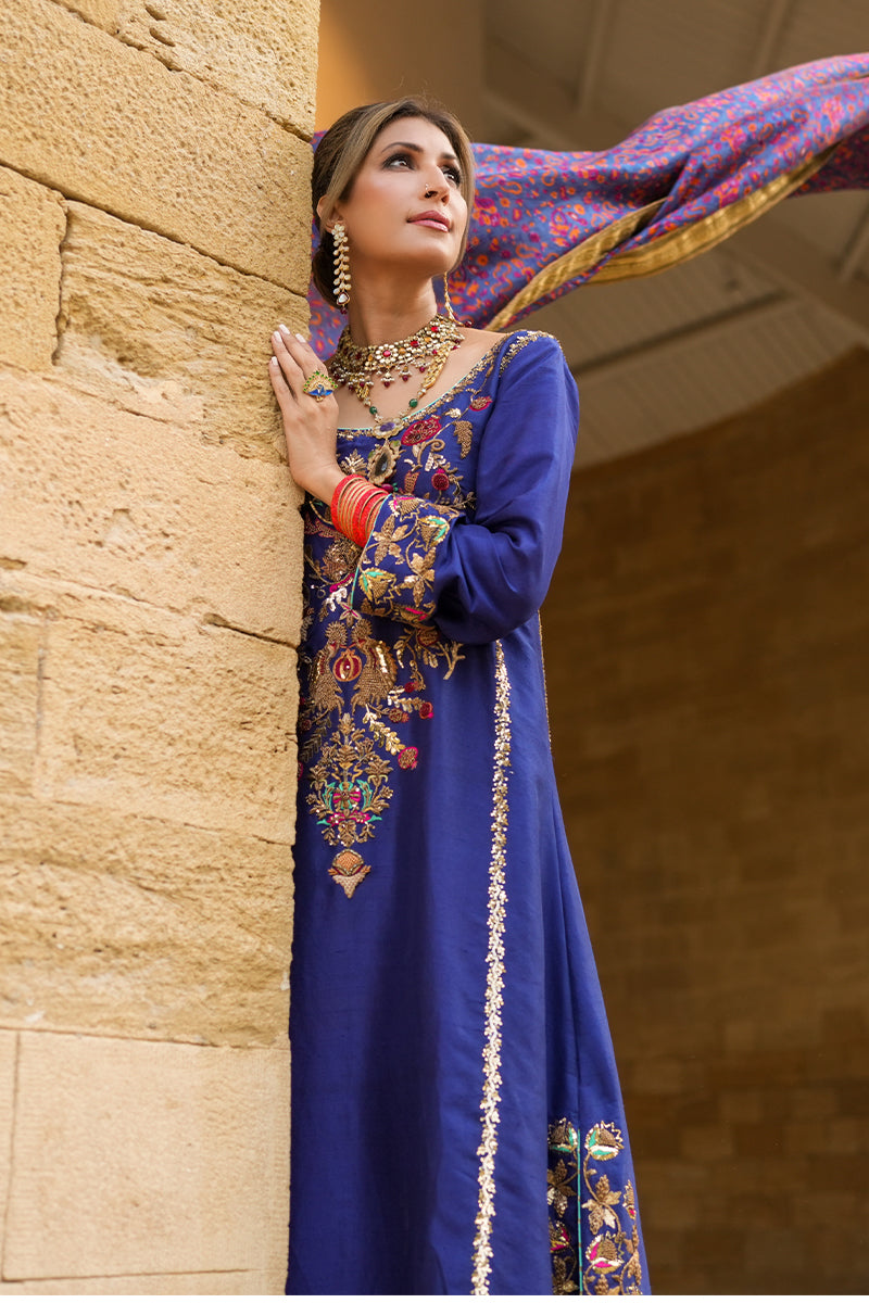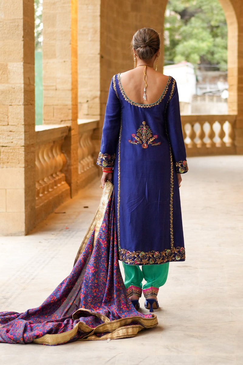 A three-piece outfit in a deep, vibrant blue raw silk combines the grace of traditional craft with the luxury of fine detail. Delicate floral and pomegranate motifs are adorned with intricate zardozi, shimmering crystals, resham, dabka, and nakshi work, creating a textured tapestry that reflects exceptional artistry. Soft accents of red and sea green are thoughtfully placed to enrich the design, while the sea green shalwar introduces a refreshing balance of color. Completing the look is a handcrafted block-print dupatta with gota echoing the outfit's elegance with each precisely stamped pattern. A harmonious blend of cultural richness and meticulous craftsmanship, this piece captures sophistication for any cherished occasion.