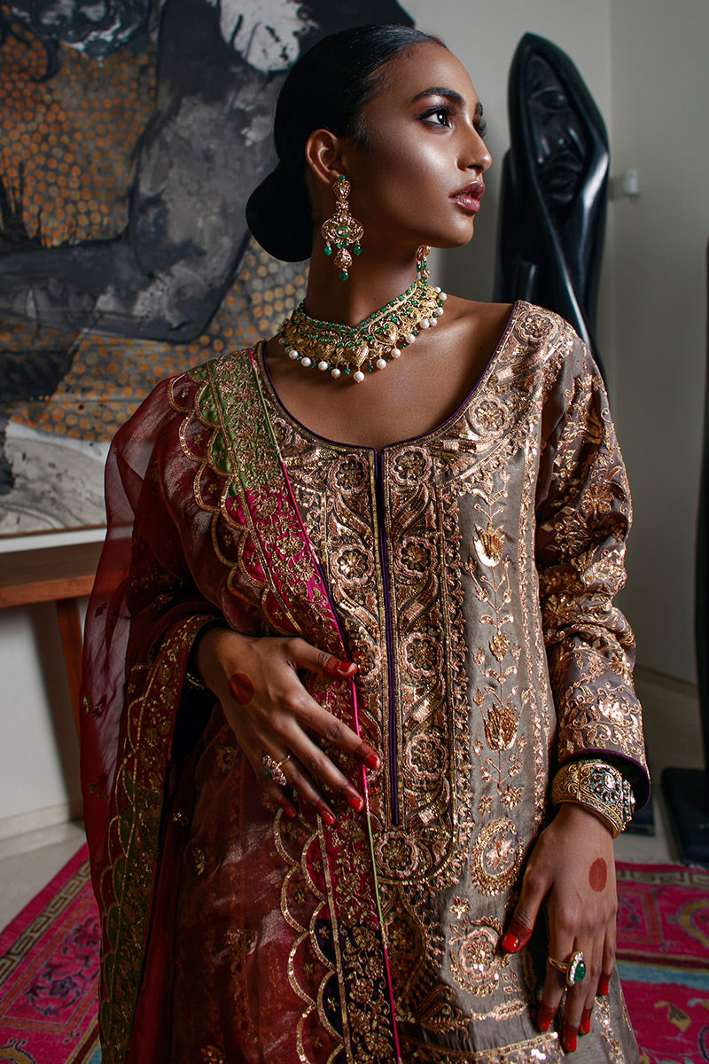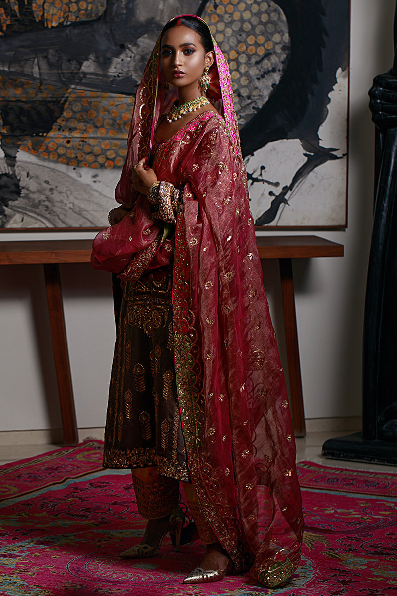 A dark molten beige silk kurta heavily adorned with Zardozi/Sitara work, a four yard vibrant magenta pure tissue duppatta with vibrant worked border. Gold worked tissue shalwar perfectly completes the outfit.