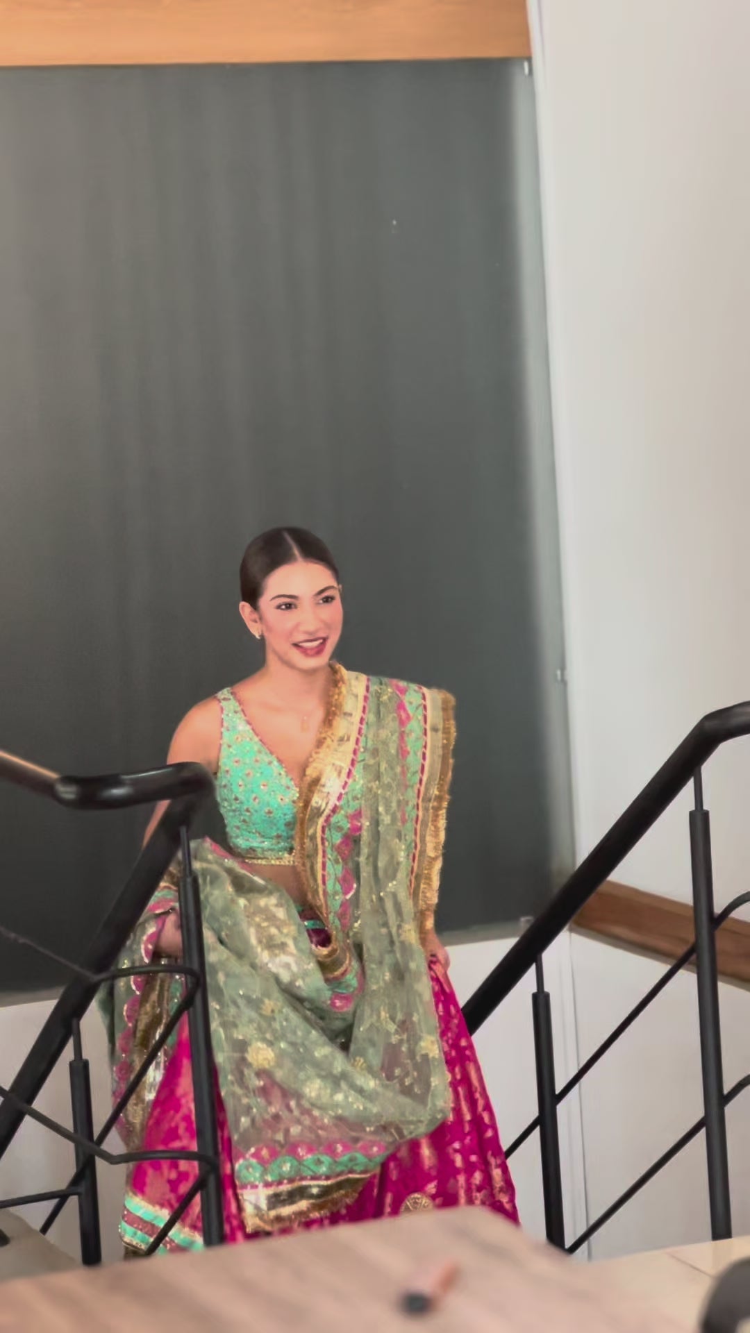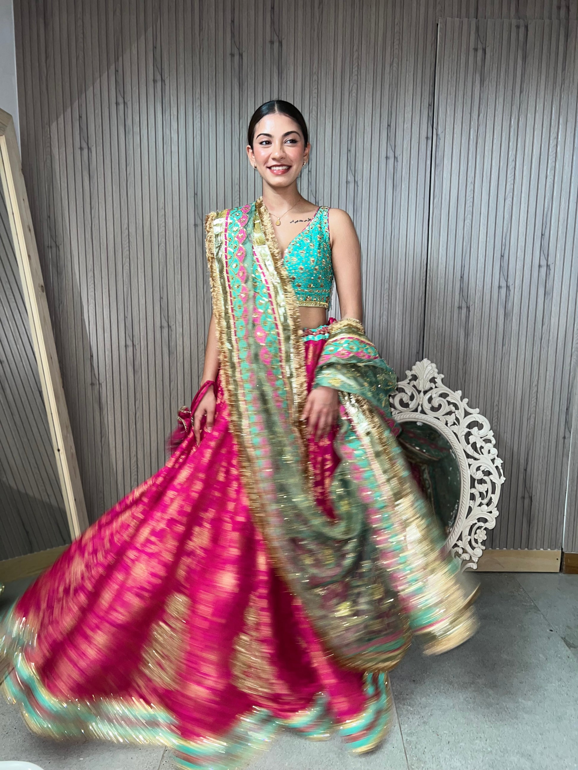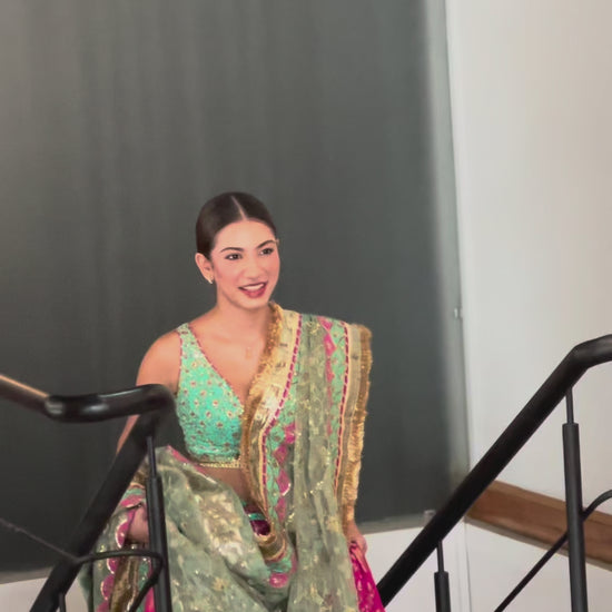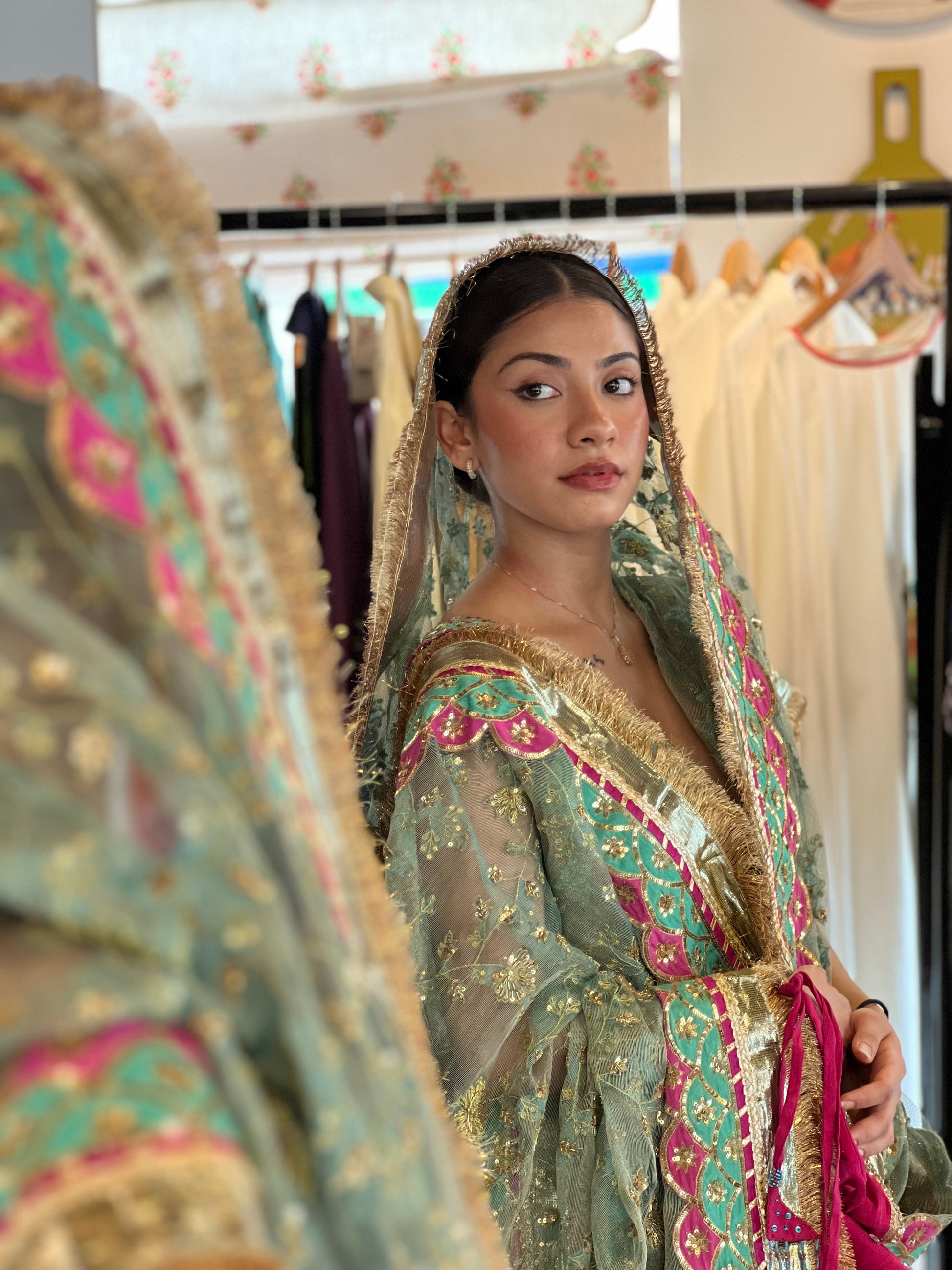 A luxury formal created for wedding season, this ensemble brings together traditional craft with a modern, luxe finish. The choli features intricate hand embellishment, crafted delicately to catch light from every angle. Paired with a voluminous jamawar ghagra adorned with gota detailing throughout, it creates a statement silhouette.