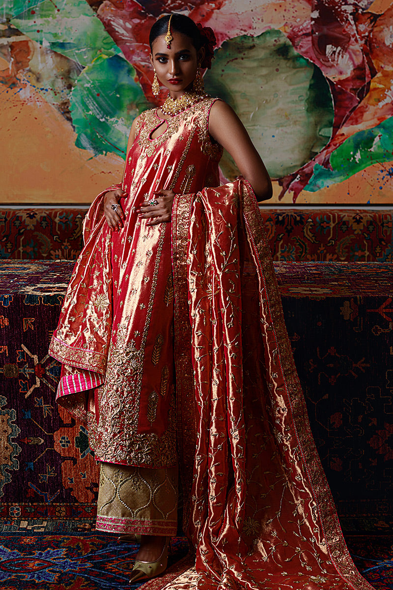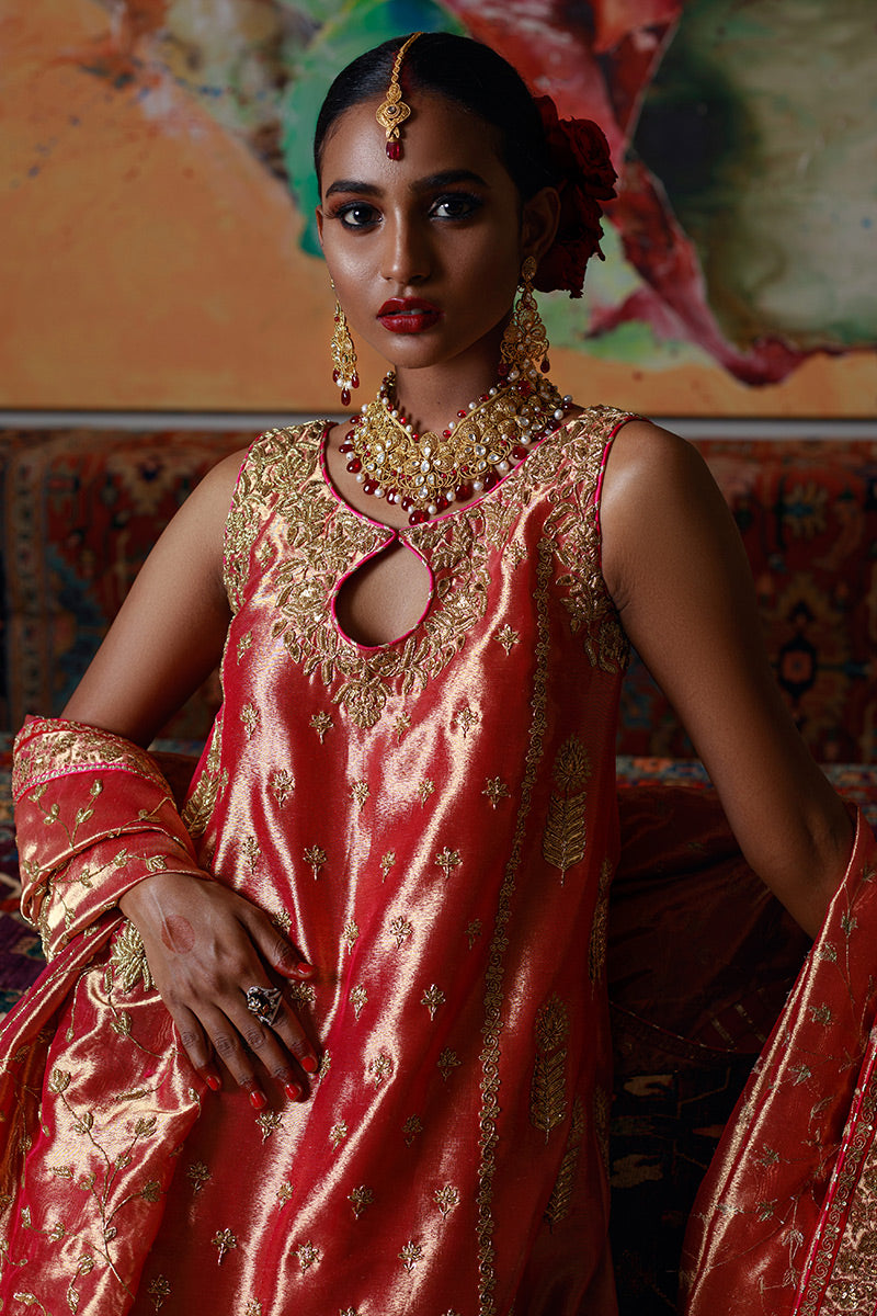 A glowing work of art in pink tissue with a heavy worked border on the shirt depicting the traditional 'shikar gah' motif. The piece de resistance for this ensemble is the four yard tissue dupatta covered in a heavy zardozi 'jal'. Gota 'jal' along with a sequins boder covers the gold izzar pant