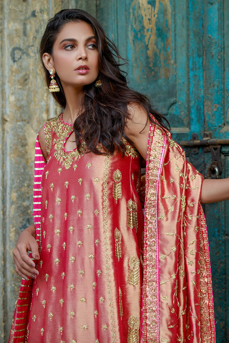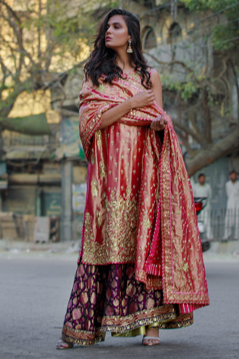 A glowing work of art in pink tissue with a heavy worked border on the shirt depicting the traditional 'shikar gah' motif. The piece de resistance for this ensemble is the four yard tissue duppatta covered in a heavy zardozi 'jal'. A deep burgundy jamawar culotte with zardozi worked boders further enhances the richness of the outfit.