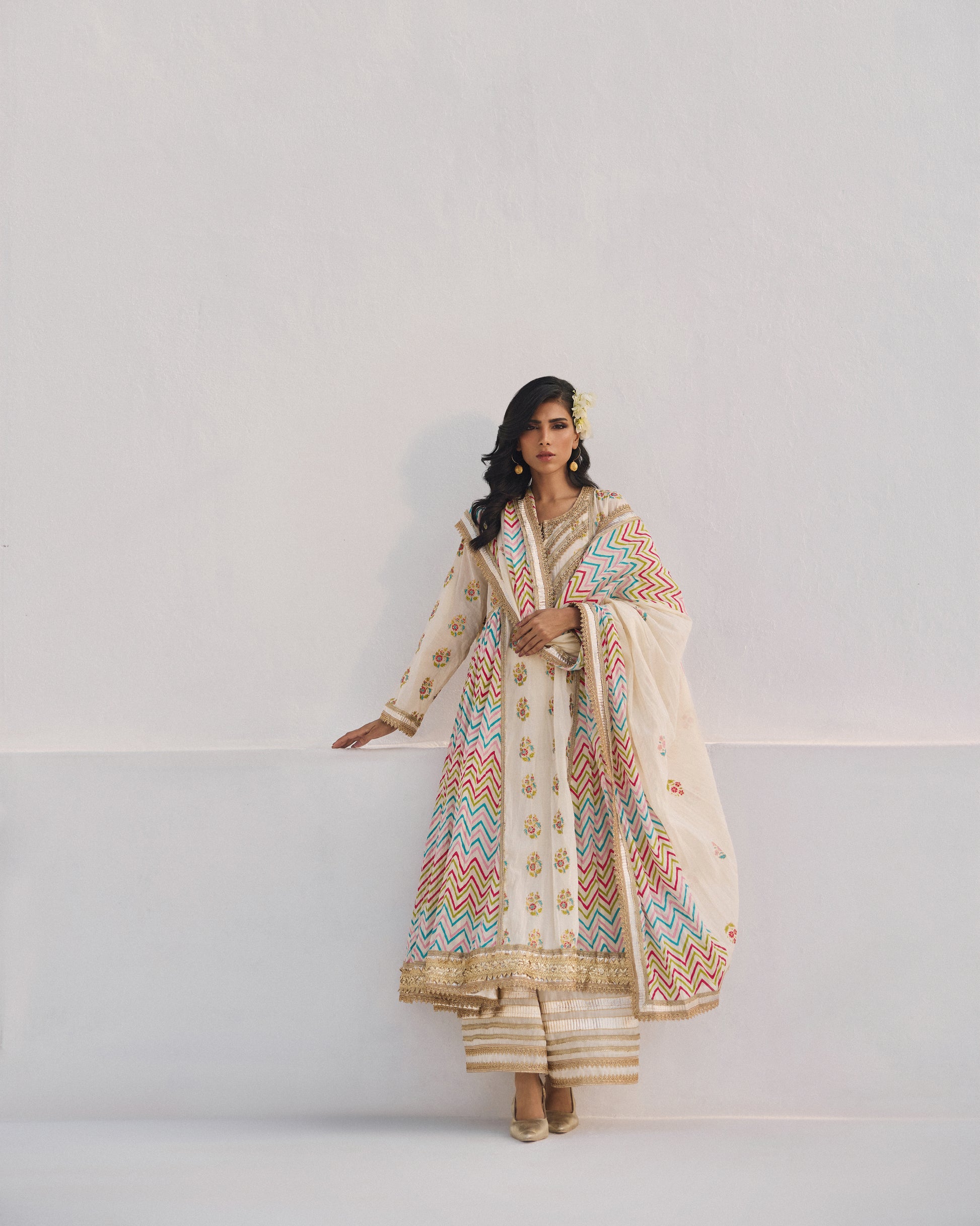 Silsila celebrates color with its vibrant multi-tone chevron block patterns, each stripe meticulously carved and printed in ferozi, citrus, hot pink, and soft pink. The block printing is highly detailed, giving each line crisp definition against the Ivory muslin. Light floral blocks add rhythm, while delicate gota trims elevate the outfit into festive luxury. Paired with a lively dupatta echoing the same geometric precision, Silsila feels joyful, youthful, and artistically rich.